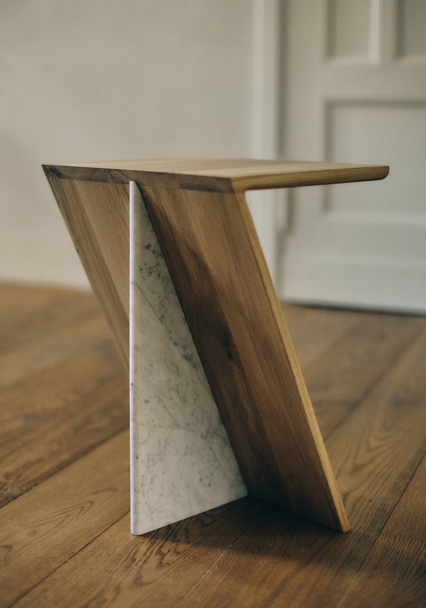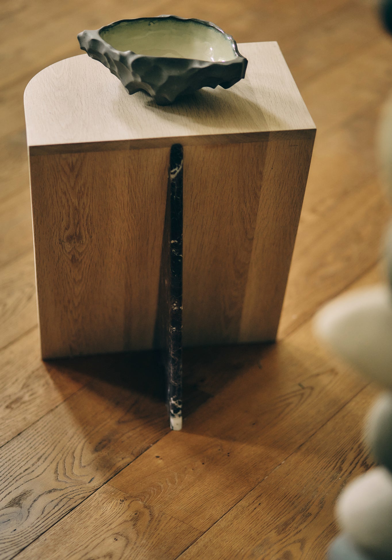 Jego bryła jest prosta, ale nieoczywista — zaskakuje proporcjami, detalem, zestawieniem materiałów. Krawędzie są subtelnie zaoblone, miękkie w dotyku, zapraszające. Gładkość dębu kontrastuje z ziarnistością kamienia. To mebel, który chce się poczuć – nie tylko wzrokiem, ale całą dłonią.